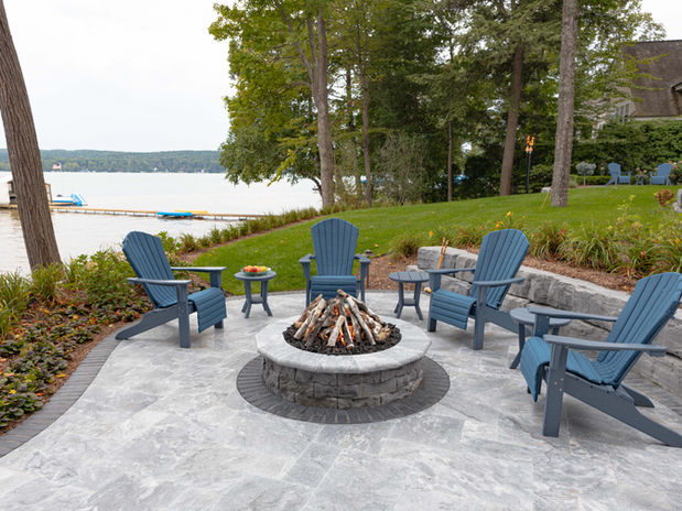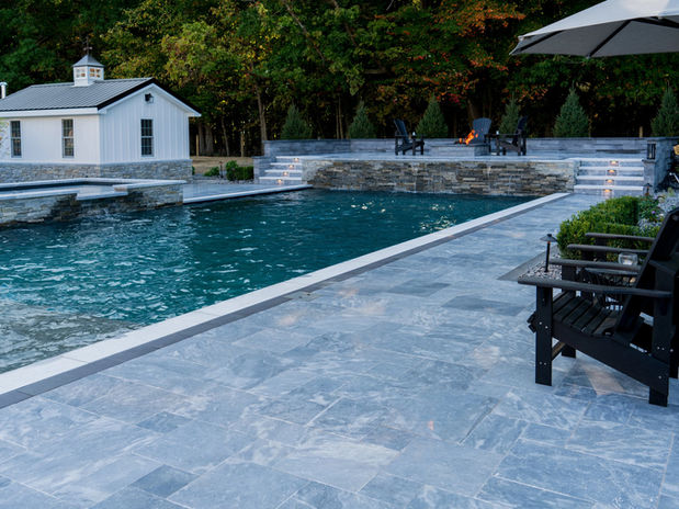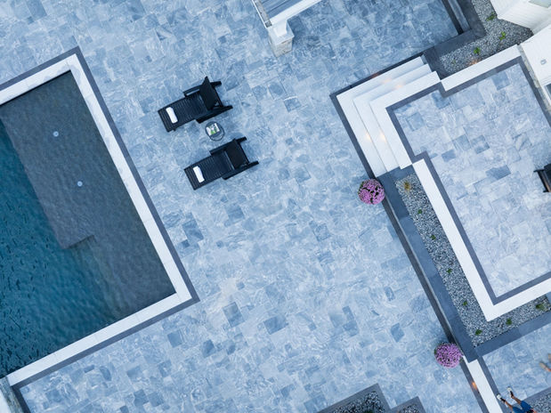 Azure natural stone marble pavers consist of cool grays and soft blue tones in both an antiqued finish that portrays an aged look consisting of a smooth surface and tumbled edges, or a sandblasted finish with a lightly textured surface and modern, straight edges.
